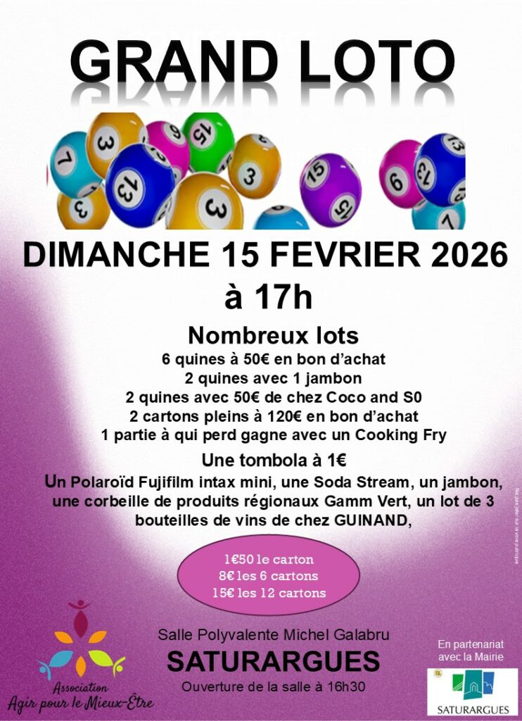 1ER GRAND LOTO LE DIMANCHE 15 FÉVRIER A 17H00 Salle Michel Galabru Saturargues